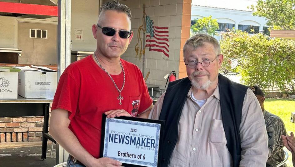 The Escondido Times-Advocate June 15 honored the Brothers of 6 Charities with the newspaper’s first annual Newsmaker of the Year award. The award goes to the person or organization that has been the most active newsmaker in the previous year. Times-Advocate editor David Ross (right) presents the award to Brothers of 6 Charities President Stef Holden at a recent meeting of the Brothers of 6.